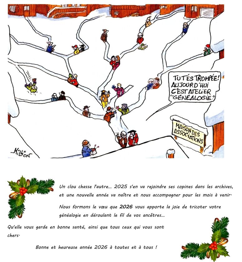 Le confinement vous aura peut-être permis de progresser dans vos recherches personnelles. Aussi nous, les membres du bureau, formons le Voeu que 2021 nous permette de nous retrouver tous, pour partager et échanger à propos de nos trouvailles généalogiques.